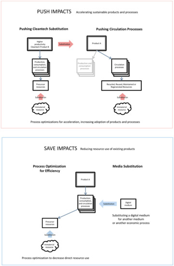 Save and push impacts modelled with Hilty and Aebischer’s resource-use hierarchy diagrams [1,21]. Save impacts decrease environmental impact by optimizing resource use in the production, consumption and circulation processes of a Product A, or substituting them with a digital medium. In contrast, push impacts accelerate production, consumption and circulation processes to either maximize the adoption of a cleantech Product B that substitutes for a legacy Product A, or to increase the circulation of wasted resources to provide Product A.