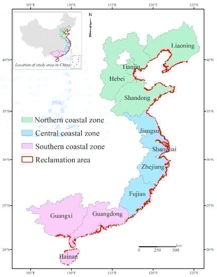 The rapid urbanization of the coastal cities has been a feature of the past 20 years. Increasing population pressure and economic growth have resulted in the excessive expansion of terrestrial land toward the coastline. The most extensive reclamation areas are located in the coastal metropolises, with dramatic land claim occurring in Binhai new zone (Tianjin), Laizhou Bay (Shandong), Yancheng (Jiangsu), Hangzhou Bay (Zhejiang), Min River estuary (Fujian) and the Pearl River Delta (Guangdong). The high intensity of land reclamation has resulted in severe pressure and increasing vulnerability in coastal ecosystems, which has led to high ecosystem services loss []. More details on coastal reclamation data are provided in the next section and in the results.