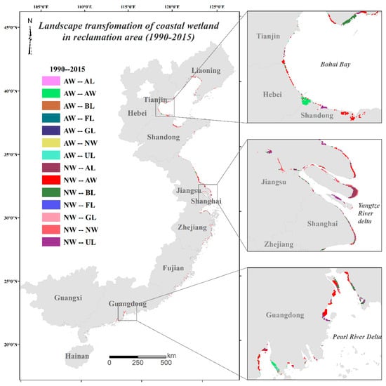 The coastal reclamation area was represented with vector data, which were calculated based on the extracted coastline data obtained by visual interpretation from 1990 to 2015 (Sajjad et al., []). The procedure used was to obtain an estimate of the total reclamation area by visual interpretation based on high-resolution satellite images (Google Earth images, Quick Bird and Landsat Thematic Mapper images). In this study, the landscape patterns in the coastal reclamation area were subdivided into seven types: arable land (AL, dryland and paddy field); forest land (FL, highly covered forests, open woodland and other forests); grassland (GL, natural and artificial grassland); built-up land (BL, urban and rural built-up area, transportation area and industrial area); natural wetland (NW, inland water, marsh land and mangrove); artificial wetland (AW, saltern land and aquaculture feeding ponds) and unused land (UL, bare land, rocks, newly claimed land). The value, used for coastal wetlands in 1990 in this study, was obtained from the wetlands map with 1*1 km resolution (provided by Niu et al.) []. In order to be integrated with reclamation data, coastal wetlands were classified into two types: natural wetland and artificial wetland. Ultimately, the landscape transformation of both natural and artificial wetlands to different reclamation landscape types was estimated through ArcGIS tool.
