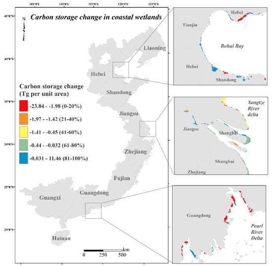 Due to the transition of economic development in the most developed metropolitan areas, the conversion into increased built-up lands is the second largest landscape transformation from natural wetlands. Large industrial complexes, coastal interstate highways, and airports have been built along the coastal zone, filling in sites that were occupied by natural wetlands. In total, 43.5% of coastal wetlands have been lost, notably the major loss of mangroves due to coastal expansion in many developing metropolitan areas [,]. The current status of blue carbon coastal wetlands in China reflects the serious conflict of human activities and natural habitats conservation. Areas of significant carbon storage loss (the top 20% of carbon loss shown in Figure 3 with red color) emphasize the most important priority sites in maintaining and recovering blue carbon in coastal areas.