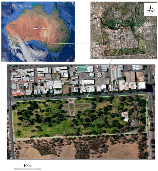 The city of Adelaide sits at an average elevation of 50 m above sea level, and Mount Lofty, with a maximum elevation of 727 m, is the highest point of the Adelaide plain. Compared with South Australia, Adelaide’s climate is known as atypical, because Mt. Lofty is the most influential topographic feature. According to the Köppen climate classification, Adelaide has a Mediterranean climate. It has hot, dry summers and mild short winters. The average temperature ranges from 13.7 °C (56.7 °F) in August to 21.2 °C (70.2 °F) in February. The Adelaide plains receive 95 mm and 19 mm monthly rainfall in winter and summer, respectively. Soils in the Adelaide region include alluvial soils, red-brown earth, and brown soil. The Adelaide Parklands are irrigated with the GAP recycled wastewater (Figure 1). Due to the heterogeneity of species, the source of irrigation, accessibility, safety, and existing research records, Park 21 was selected as the study site. The southern part of Park 21, occupying 10.5 hectares, is located between the latitudes of 34°56′8″ S and 34°56′15″ S and the longitudes of 138°35′40″ E and 138°36′1″ E. It has more than 60 different species and types of landscape trees and shrubs with broad coverage of Kikuyu turf grasses [10]. This heterogeneity helps to investigate the range of soil salinity tolerance in many species. A regular soil salinity map over the years will assist in understanding the physical behavior of different species on adapting to temporal changes of salinity.