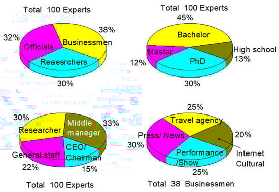19]. We invited a total of 100 Experts who live and work in Shaanxi Province, they are officials from cultural and tourist administration, businessmen from cultural companies and travel agencies, and researchers from colleges or institutes. The professional composition, knowledge gap, administrative position, and detail careers of the experts are shown in