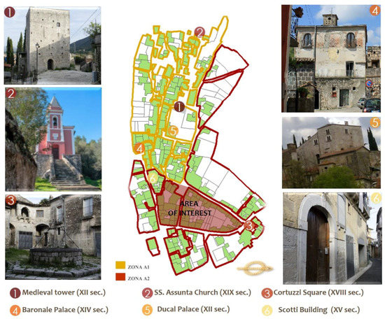 The settlement mostly retains its 15th century structure. The building settlement of the historical centre is located along the west–east direction towards the shrine of Maria S.S. Assunta (Figure 7). The three main longitudinal roads (Via Biondi, Via PortaFerrata—Via Sopportico, Via Marconi—Via Vicinato) are connected by stairs, paved areas, porticos, and arches. The northernmost part of the historical centre is connected to the remaining part through Via Cortuzzi and Corso Italia. This consisted originally of a pattern of linear streets following the same parallel direction, which were broken by orthogonal roads. During the centuries, the original road apparatus was enriched with new directions of development and new streets. Among the architectures of greater interest in the historic centre, there are: the Norman tower, the S.S. Assunta shrine, the baronial palace with the dovecote tower, and piazza Cortuzzi with its respective baronial palace. The study area covers urban areas A1 and A2 of the 2008 PRG Variation. For these areas, the interventions allowed are those provided for in the Recovery Plan approved by C.C. n. 119 of 30/12/1988, and no. 26, dated 28/06/1991, and drawn up in accordance with art. 28, Law 457/78 and art. 29 Law 219/81.