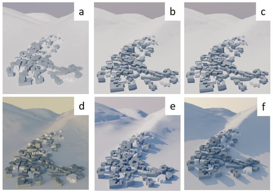 Shadow exposure at: (a) 21 June at 9:00; (b) 21 June at 13:00; (c) 21 June at 16:00; (d) 21 December at 9:00; (e) 21 December at 13:00; (f) 21 December at 16:00.