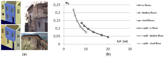 The most recurrent out-of-plane failure mechanism, namely the wall overturning, can be evaluated for masonry S.U. of historical centres on the basis of the principle of virtual work, which provides the collapse load multiplier α0 activating that mechanism. Based on the previous research activity illustrated in Formisano et al. [34], these multiplier factors were determined for several masonry walls, belonging to buildings with one to three storeys, by considering the variability of input data (mechanical properties of the masonry, wall thickness, number of floors, storey height, geometry of openings, and type of floors). As an example, these multipliers related to the building with two storeys have been plotted as a function of the wall slenderness (h/t) in Figure 6.