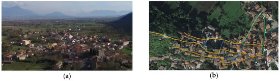 Panoramic view of Baia: (a) historical centre, (b) satellite view with recognition of streets.
