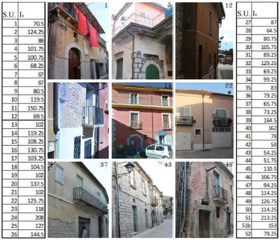 Summary table of vulnerability indexes and photos of some investigated structural units.