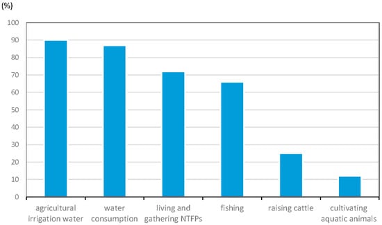 According to the survey, the indigenous Ban Don Daeng people used natural resources from the Nongchaiwan wetland in many ways: 90% used wetland water for agricultural irrigation, 87% used the water for consumption, 72% used the wetland for crop farming and gathering non-timber forest products (NTFPs), 66% for fishing, 25% for raising cattle, and 12% for cultivating aquatic animals such as leech and shrimp for distribution (Figure 2).