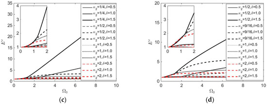 Variations of displacement error amplification factor with respect to : (a) ; (b) ; (c) ; (d) .