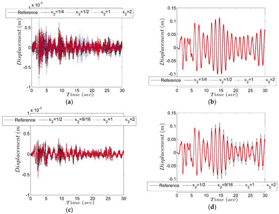 Although the cumulative displacement error can be significantly reduced with the increase of , the accurate displacement response at first story is still overlapped by the error (Figure 5a,c). As for , the displacement at the second story is in good agreement with the reference value and less affected by the displacement error (Figure 3b). As for , the displacement at the second story is also less affected by the displacement error, but the accuracy of the numerical result is impaired due to the existing of numerical damping of the integration algorithm (Figure 3d). The maximum displacement (0.094 m) at the second story calculated using the GCR algorithms with are 83% of the reference value (0.113 m).