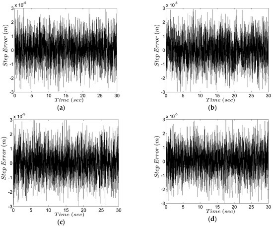 Displacement error at each time step: (a) , first story; (b) , second story; (c) , first story; (d) , second story.