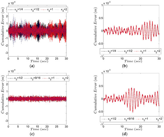 Cumulative displacement error: (a) , first story; (b) , second story; (c) , first story; (d) , second story.