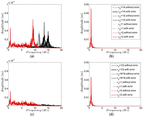 Figure 6a implies that the displacement at the first story is contributed by the first and second order of modal responses. The first order frequency obtained by several GCR algorithms are very close and approximately 0.7060 Hz, which is slightly smaller than the first order frequency of the structure, i.e., 0.7114 Hz. This is due to period elongation [19] of the integration algorithm. However, there exists obvious difference of the second order frequency between the calculated value by using several GCR algorithms and the actual frequency as period elongation increases with the increase of Ω. In Figure 6c, the first order response is obvious, while the second order response is less obvious. The reason for this is the numerical damping and the random displacement error. By comparing Figure 6b,d, the displacement at the second story is only contributed by the first order modal response, which further explains the phenomenon shown in Figure 3. In addition, due to the existing of numerical damping, the spectral amplitude of is less than that of , which is consistent with the displacement response indicated in Figure 3.