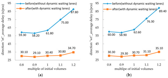 Based on the model application in Section 4.2 and Section 4.3, this section will analyze the effect of the traffic volume on vehicle delay. The traffic volumes of the directions with dynamic waiting lanes (direction of “et”,”el”,”wt”, and “wl”) were increased or decreased by 10% uniformly. The other (direction of “st”,”sl”,”nt”, and “nl”) remained unchanged. Table 6 provides the explanation for the variation of the volumes.