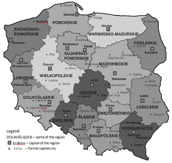 Until 1998, Poland was divided into 49 voivodships constituting field government administration. The perspective of accessing the European Union structures and assigning regions with the task of regional policy implementation required introducing corrections in this division and establishing larger, economically stronger voivodships. Following the administrative reform, which came into force on 1 January 1999 [5], sixteen new voivodships were established in Poland, corresponding in size to the similar regional divisions of the European Union Member States. Simultaneously, in place of the existing forty nine voivodship capitals, only eighteen cities retained the capital functions as the voivodship cities. Fourteen of them, i.e., Białystok, Gdańsk, Katowice, Kielce, Kraków, Lublin, Łódź, Olsztyn, Opole, Poznań, Rzeszów, Szczecin, Warsaw, and Wrocław, also remain the seats of the voivodship governor and the headquarters of the voivodship local government. In two voivodships, these functions were separated. In Kujawsko-Pomorskie the voivodship city—Bydgoszcz is the seat of the voivodship governor, whereas Toruń hosts the headquarters of the voivodship parliament and the marshal’s office. A similar situation is true for Lubuskie voivodship: Gorzów Wielkopolski is the seat of the voivodship governor, while Zielona Góra hosts the headquarters of the local government bodies [6]. In most cases, the new capitals had already played the functions of regional centres, hence the administrative changes justified such situation. In four cases, the establishment of voivodships resulted from a political consensus (Lubuskie, Kujawsko-Pomorskie voivodship, Świętokrzyskie voivodship, and Opolskie voivodship) (Figure 1).