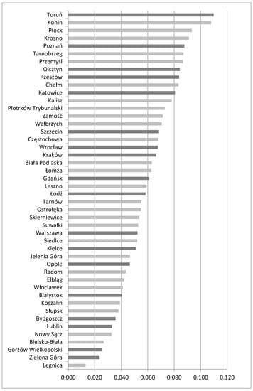 The significant diversification is well visible—the measure value for Toruń is 0.110, whereas for Legnica 0.013 (Figure 2).