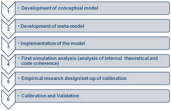 Agent-based modeling (ABM) is the methodology on which the present research is based. The CARIS lab is built to explore and understand self-sustaining innovation cycles in European regions and to help policy-makers in designing adequate interventions toward innovation and growth in European regions, particularly with regard to the lagging regions. In fact, more recently, agent-based modelling (ABM) has been increasingly recognized as a helpful tool to support policy making in different fields and at different levels [31,36]. Put differently, it is claimed that complexity science suggests that methodologies, such as ABM, are crucial to develop a deep understanding of multi-dimensional innovation issues, which significantly aid policy-makers in bringing about societal changes in a complex world [36]. Cooke [36] adds, “No complex issue, challenge or problem can be addressed by focusing on effectively a single issue or dimension, as they do not exist in isolation: the different interrelated dimensions interact with each other. Once the complex problem-space has been identified, that understanding can be used to co-create with the relevant stakeholders an enabling environment, which addresses all the relevant interrelated issues at the same time” ([36], p. 268). Figure 1 shows the methodological steps to set up a computational laboratory.