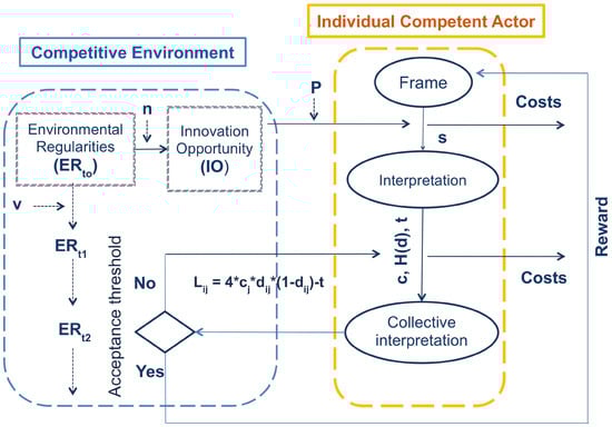 The volatility (v) of CE represents the turbulence of the competitive environment and measures the distance in time between two different environmental regularities (ERs) produced by the CE. ICAs cannot access directly to the ER, because of an environmental noise (d), that alters the content of the ER transforming it in a set of new strings, named “innovation opportunities (IOs)”.