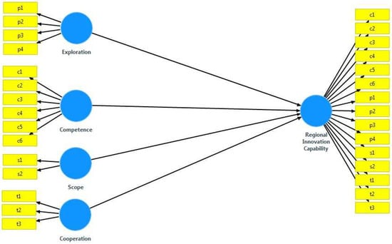 The statistical validation of the measurement model was performed through partial least square structural equation modelling (PLS-SEM). This soft-modelling technique allows measuring the impact of a set of indicators on the overall latent construct. An important advantage is that PLS-SEM allows researchers to assess both the measurement model and structural model at the same time. The measurement model specifies the indicators for each construct and lets to evaluate the construct validity. The structural model focuses on the causal relations among the latent variables. Observed variables, based on the indicators of ProInno RIS, have been assigned to a latent variable of the model as reported in Figure 3.