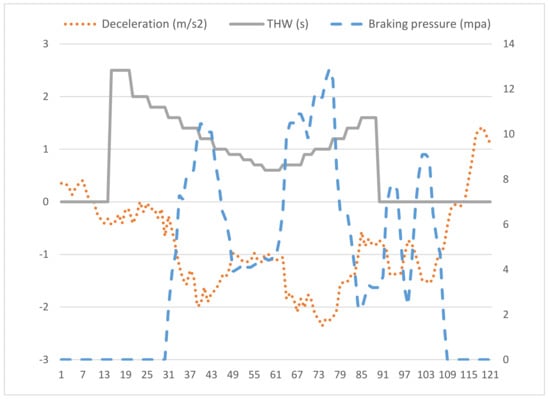 Tarko et al. [23] stated that surrogate measures must meet two conditions: first, they should be associated with a non-crash, and, second, there should be a method for transforming the non-crashes into a frequency or severity of crashes. In this study, the two conditions of surrogate measures are considered. For the first condition, braking pressure, time headway, and deceleration represent the near-crash events, and they were included in previous studies as parameters related to risk and crashes. By observing these actions, we found that, without them, a crash may have occurred.