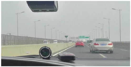 To collect near-crash data from naturalistic driving, experiments were undertaken using an instrumented vehicle on different road types in the city of Wuhan. During the experiments, each participant was informed to maintain his or her regular driving style as much as possible. In addition, to ensure that the experiments were standardized and conducted in similar conditions, the participants were asked to drive on the same routes using the same instrumented vehicle during the same periods. Experiments were conducted in September, October, and December 2016. Figure 2 shows the view from the test vehicle and its equipment and surroundings during the naturalistic driving experiment.