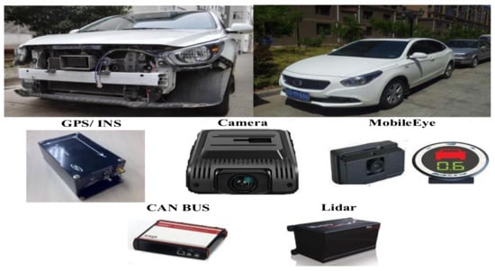 A GPS/INS was used to obtain the latitude and longitude of the vehicle along with the three-axis acceleration. Time headway, lane position, and lane departure were recorded by the MobilEye device. A video camera was used to obtain environmental information during the experiments. The data for the driving behavior variables (including speed, accelerator pedal, brake pedal, and steering wheel angle) were collected by a CAN BUS. A LiDAR device was used to collect the target (vehicle) information (such as distance, velocity, relative velocity, etc.).
