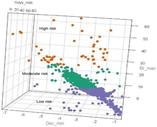 After implementing the cluster analysis, near-crash events were grouped into three levels based on their driving risk: low, moderate, or high. Figure 4 shows the clustering results and Table 4 presents the statistical details of the three risk levels.