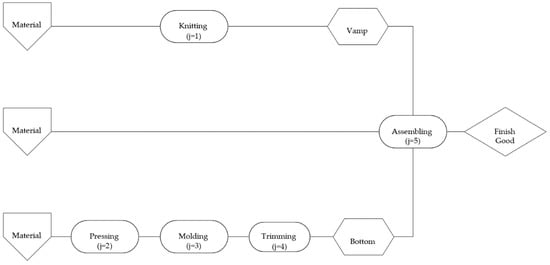 In Figure 1, there are five main manufacturing activities to produce knitted shoes, including knitting (j = 1), pressing (j = 2), molding (j = 3), trimming (j = 4), and assembling (j = 5). Knitting (j = 1) is used to manufacture vamps using a knitting machine, and pressing (j = 2), molding (j = 3), and trimming (j = 4) are used to manufacture bottoms. The vamps and bottoms are combined to become shoes through the activity of assembling (j = 5). These processing activities use human labor hours and-or machine hours. There are also two supporting activities, setting up (j = 6) and material handling (j = 7).