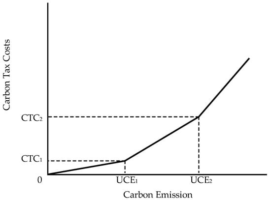 () is a special ordered set of type 1 (SOS1) of 0–1 variables in which only one variable can be 1, which are indicator variables. If , then from Equation (10), from Equations (7) and (8), from Equations (5) and (6), and from Equation (9). Thus, the company’s total CE quantity is from Equation (4) and the carbon tax cost is from Equation (3), respectively. The company’s total CE quantity (g) falls within the first range of Figure 2, [0, UCE1] and (g, CTC) is the linear combination of two points, (0, 0) and (, ). If , then from Equation (10), from Equations (5) and (8), from Equations (6) and (7), and from Equation (9). Thus, the company’s total CE quantity is from Equation (4) and the carbon tax cost is from Equation (3), respectively. The company’s total CE quantity (g) falls within the second range of Figure 2, (UCE1, UCE2] and (g, CTC) is the linear combination of two points, (, ) and (, ). Similarly, if , then the company’s total CE quantity (g) falls within the third range of Figure 2, (UCE2, UCE3), i.e., from Equation (4) and the carbon tax cost is from Equation (3).