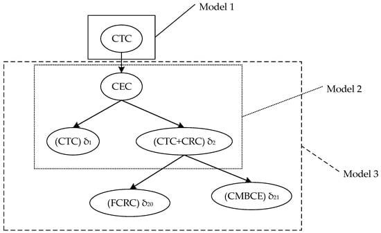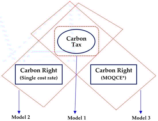 The main difference between these three models is the carbon emissions cost. If the carbon emissions costs are represented by the components, the three models explored in this paper can be shown in Figure 4. Model 1: The manufacturer only takes CTC into consideration when determining their carbon emissions cost (CEC), so the manufacturer would not undertake carbon trading to purchase CR. Model 2: the manufacturer would consider whether it purchases CR in the market or not; CEC would be equal to (CTC) if the manufacturer does not purchase CR, or equal to (CTC + CRC)δ2 if the manufacturer purchases CR at a single carbon rights cost rate during carbon trading. Model 3: The manufacturer would consider whether to purchase a minimum order quantity of carbon emissions (MOQCE) to satisfy their demand, considering that CRC is equal to a fixed carbon rights cost (FCRC), or the manufacturer can purchase CR at a single carbon rights cost rate if CE exceed MOQCE.