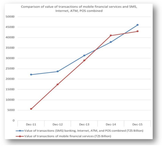 The penetration of mobile phones is a very important factor in spread of mobile money, and it is indeed very helpful in increasing the chances of improving financial services for the financially excluded population. Countries across the world have different level of mobile money penetration, hence, financial inclusion. Considering the access pattern for both traditional banking and mobile money financial services standing at 51% cumulatively, usage and storage are inseparable. As shown in Figure 1, the percentage of access to financial services through mobile financial services (80%) is higher than the access through traditional banking services (22%). This means the surge in transaction on the side of the banking system is mainly contributed by the mobile network operators through mobile financial services. As shown in Figure 2, in 2014, the value of transactions through mobile financial services was greater than through banking channels. The steady growth of the transaction of the mobile financial services from 2011 to 2014 is noted. Such steady growth of the value of transactions on the side of the banking channels is also noted in 2012—the effect of the synergy between the banking financial institutions and mobile network operators. Another factor that attributed to sharp increase in the value of SMS banking transactions and Internet Banking transactions was the increase in the number of banking institutions offering the mobile SMS and Internet banking: from 21 and 19 in 2014 to 30 and 23 in 2015, respectively (2015 DBS Annual report).