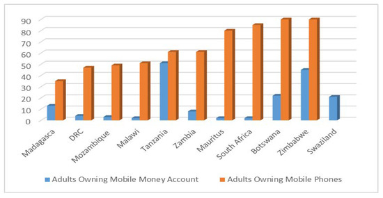 Using data from Finscope [29], this paper conducted an analysis to compare the penetration mobile phone and mobile money account ownership for 11 SADC countries, and the results are presented in Figure 3. Figure 3 show that, Swaziland is ranked number one with 92% of its adults owning a mobile phone while Madagascar is ranked the last in that order with only 35% of their adult population owning a mobile phone. This study shows that the level of per capita income of the country is unrelated to mobile money service penetration. Therefore, it is not surprising to find that Swaziland and Zimbabwe have higher mobile phone penetration than South Africa and Mauritius although their per capita income level is lower than the later. This suggests that there are factors at play other than income that explain mobile phone penetration across countries. More than 50% of the adults in most of the countries in the dataset possess mobile phones, except Madagascar, the Democratic Republic of Congo and Malawi. Lower level of mobile phone penetration in such countries may harm the level of financial inclusion because mobile money services may be at risk.