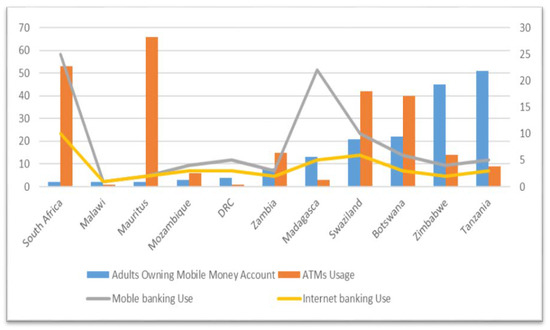 The improvement of technology has completely changed the ease of accessing financial services. The emergence of Automated Teller Machines (ATMs) has simplified the twenty-four-hour access to bank accounts, and this has been very helpful to users of financial services because, even after work hours, when banks are closed, customers can still get bank services. Moreover, banks also introduced mobile banking and Internet banking to further revolutionize the way people access their bank accounts. Mobile and Internet banking are the advancement of ATMs because, with mobile and Internet banking, customers access their bank accounts anytime and anywhere giving them both time and locational freedom. Furthermore, with mobile money, the customer has a choice to get financial services without even opening a bank account. Using data from Finscope [29], the level of technological advancement in delivering financial services is compared across 11 SADC Countries. When it comes to usage of ATMs across 11 SADC countries Figure 4 shows that, while South Africa and Mauritius lead in usage of ATMs, Tanzania, on the other hand, is outperformed by almost all other countries with less than 10% of its adults using ATMs to get banking services. Figure 4 further shows that the use of internet banking and mobile banking is the highest in South Africa and Madagascar and the lowest in Malawi and Zambia.
