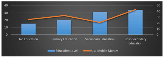 Studies also show that, apart from convenience and cost, demographic factors such as educational level of the mobile money service user and age are equally important factors which influence the adoption of the mobile money services (see, for example, Mas and Kumar, [18]). It should be appreciated that education enables mobile money usage and those without education face a lot of challenges. As shown in Figure 8 mobile phone ownership increases with increased levels of education. Figure 8 also shows clearly that education has a direct link with mobile phone ownership. The figure shows that only 20% of households without any formal education possess mobile phones followed by 25% of those with primary education and then 31% of those with secondary education. The proportion of households with post-secondary education holding mobile phones is higher than all categories and goes as higher as 43%. However, the trend of mobile phone ownership does not directly the usage of mobile money services as the usage is low among those with secondary education and higher among those with primary and post-secondary education, as stipulated in Figure 8.