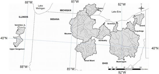 Locations of watersheds and sampling stations. The Cuyahoga, Grand, Maumee, Raisin, Sandusky, and Vermilion watersheds drain into western and central Lake Erie, while Great Miami and Muskingum watersheds drain into the Ohio River basin. The Vermilion, IL and Upper Sangamon watersheds drain west into the Upper Mississippi River basin [7].