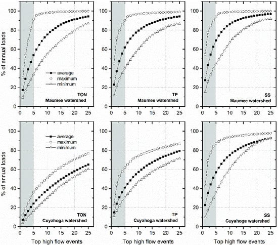 Among the three pollutants analyzed, the least variance among the loads contributed by the top one to five load events was observed for TON export, followed by TP and SS. Additionally, the top load events lasted longer while carrying a smaller percentage of annual TON loads than for TP and SS loads. Among the watersheds, for TON, Cuyahoga had the smallest variance, while Sandusky and Vermilion had the largest variance, in top load event contributions. For TP and SS, Great Miami had the least variance, while Maumee and Vermilion showed the greatest variance, in the contributions of the top one to five load events towards annual loads.