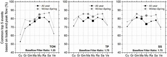 Figure 3 shows the average percentage of common top events based on total loads exported and on peak flows for all the Ohio watersheds over their complete monitoring durations. The analysis was performed for both BFR values used in this study, which were 1.25 for TON and 1.75 for SS and TP. The size of the marker indicates the watershed size (not to scale), and shows that, for most of the agricultural watersheds, more than 75% of the top five load events matched the top five events based on peak flows over the whole year. This value increased to more than 80% when the analysis was limited to the winter and spring months, when, typically, the highest pollutant export occurs in the Midwestern watersheds [27].