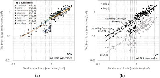 Regression relationships for total annual and top event nitrate plus nitrite nitrogen (TON) loads on (a) an individual watershed scale and (b) a spatially aggregated regional scale. Most watersheds in the study are predominantly agricultural, unlike the mostly urbanized Cuyahoga River watershed.