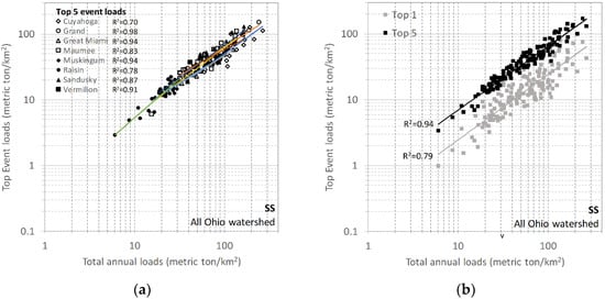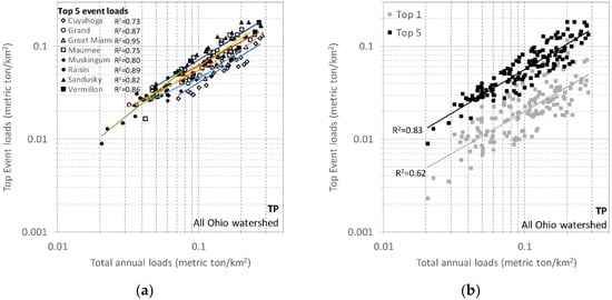 For SS export, individual regression lines are shown in Figure 6. Visually, these were the most similar among the three monitored pollutants. Consistent patterns were observed for SS export during top load events. It can be speculated that the absence of long-term trends in SS concentration in some of the Ohio watersheds between the years 1975 and 1990 [24], possibly led to fewer variations in both annual loads and top load event loads. This resulted in the better predictability of SS. For spatially aggregated regression lines, a high adjusted R2, increasing from 0.79 to 0.94, was observed for annual SS load contributions from the top one and five load events, respectively. These adjusted R2 values for the spatially aggregated regressions were the highest among the three monitored pollutants.
