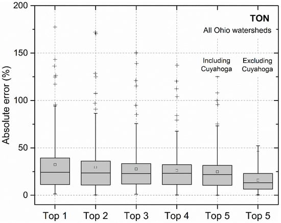 The various regression lines developed in the study were used to predict total annual loads, and the distributions of relative errors in predicting annual loads are presented using box and whisker plots. Regression analysis was carried out for different levels of watershed aggregation, ranging from individual watersheds to aggregation by similarity, for example: by similar land use; or by proximity, such as all watersheds in the Lake Erie and Ohio River basins (Ohio watersheds). Firstly, for all three pollutants, the spatially aggregated regional regression line using all eight Ohio watersheds was used to predict annual loads from the top one to five load events. The resulting TON predictions are shown in Figure 7. Secondly, based on the ANCOVA, watersheds with statistically similar regressions (predominantly agricultural watersheds) were grouped together to create aggregated regressions for just the top five load events, and these grouped regressions were used to predict annual loads. Thirdly, individual watershed-specific regressions for the top five load events to predict annual loads were used to calculate prediction errors (Figure 8). Figure 7 shows the relative errors in annual loads predicted using the spatially aggregated regression lines. Relative errors were defined as [35]: