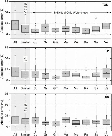 Figure 8 also shows the distributions of relative errors for annual load predictions for watershed and pollutant-specific regression equations from the top five load events. These watershed-specific regressions performed better compared to spatially aggregated regressions. For TON, the median relative errors ranged from 7.3% for Muskingum to 18.7% for Vermilion, while the average median relative error for all watersheds was 11.6%. The maximum relative error ranged from 36.9% for Sandusky to 22.5% for Muskingum, while the average maximum relative error was 29.4%. For TP, the median relative errors ranged from 4.9% for Great Miami to 16.2% for Maumee, while the average median relative error for all watersheds was 11.9%. The maximum relative error ranged from 49.0% for Cuyahoga to 11.3% for Great Miami, while the average maximum relative error was 29.8%. For SS, the median relative errors ranged from 6.3% for Great Miami to 16.4% for Maumee, while the average median relative error for all watersheds was 11.3%. The maximum relative error ranged from 44.1% for Cuyahoga to 17.6% for Great Miami, while the average maximum relative error was 25.8%. The average standard deviation observed for these individual watershed specific regressions was 7.19%.
