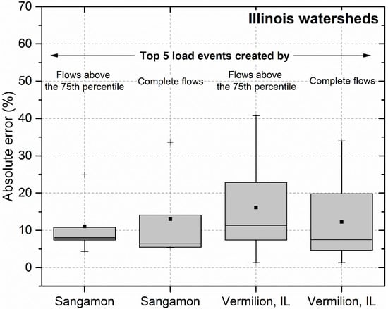 The results using the 75th percentile flow threshold indicated that the median absolute prediction error for annual TON loads was approximately 6.42% and 7.52% for the Upper Sangamon and Vermilion watersheds, respectively in Figure 9. The maximum errors were 33.6% for Upper Sangamon and 33.9% for Vermilion. When using the complete flow data from Upper Sangamon and Vermilion, the median absolute prediction errors changed to 7.99% and 11.4%, respectively, and maximum error changed to 24.9% and 13.6%, respectively.