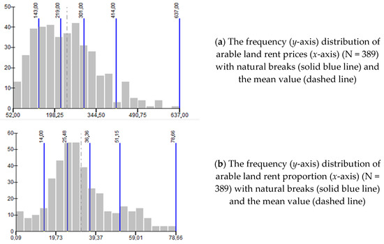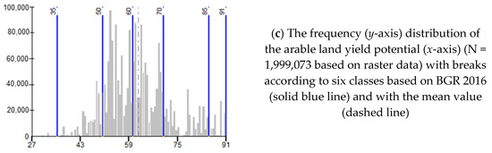 The arable land rent price as well as the arable land rent proportion were calculated and visualized for NUTS-3 regions, which reflects the highest spatial resolution that can be acquired at the national scale for these data. Rent proportion and rent price data were not normally distributed and thus were classified for the spatial visualization based on Jenks (natural breaks), which is a common and suggested method given an uneven distribution (Figure 1a,b). The method orientates itself on natural data gaps and classifies the data in such a way that variations within classes are as low as possible while differences between classes are as large as possible [42]. For arable land yield potential, the mean value has been visualized for NUTS-3 regions. Heterogeneities within those regions can therefore not be visualized. Figure 1c represents the frequency distribution and the breaks within the arable land yield potential data based on the classification of the BGR [24] (Table 2), reflecting heterogeneities among the raster data set of almost 2 million points for Germany.