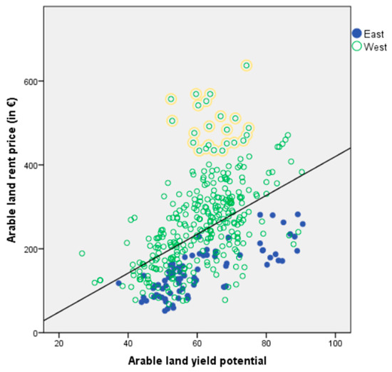 There is a weak positive correlation between arable land yield potential and rent price in Germany (rs 0.235, Figure 2). This result supports the theoretical assumption only to a limited degree. A group of 23 cases (marked yellow in Figure 2) with rent prices between 400 and 600 € (aggregated at county level in 2010) has a solid effect on the weak correlation (rs excluding these cases: 0.303, N = 366). These outliers are counties located in the northwestern part of Germany on the border with The Netherlands (compare the map in Figure 5). These counties have a high density of livestock that increases the application of large amounts of farm manure. This group of outliers appears in the West German data points potentially explaining the correlation of rs 0.274 in an otherwise quite evenly spread data cloud. In contrast to West Germany, East Germany shows a stronger correlation (rs 0.585) that again concurs strongly with the theoretical assumption that high yield potential causes high rent prices. We discuss possible explanations for the limited agreement of empirical findings with the theoretical predictions between arable land yield potential and rent prices below in Section 5.1.