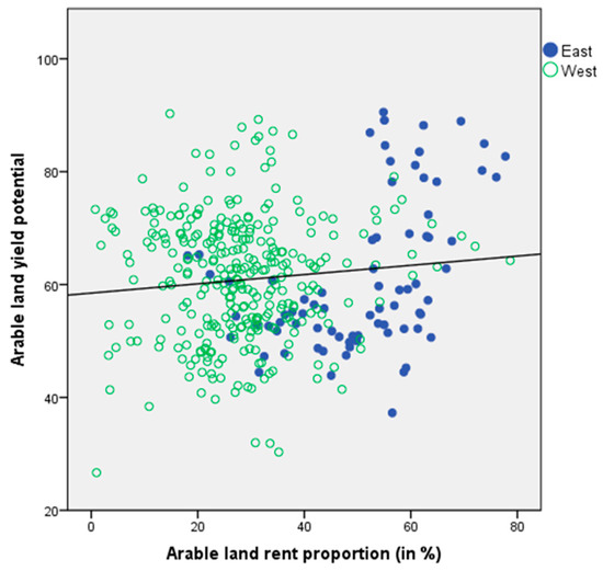 There is no correlation between arable land yield potential and rent proportion in Germany (rs 0.012, Figure 3). The scatter plot shows an evenly spread data cloud without clear groups of outliers. This also applies to the data from West Germany (rs 0.002). In contrast to West Germany, East Germany shows a weak correlation (rs 0.211). While the West German data show indifferent results, the East German data slightly contradict the theoretical assumption that high values of rent proportion cause a decrease in soil quality and yield potential. We discuss the possible reasons for the mismatch between the theoretical assumptions and empirical findings of the relationship between rent proportion and yield potential below in Section 5.2.