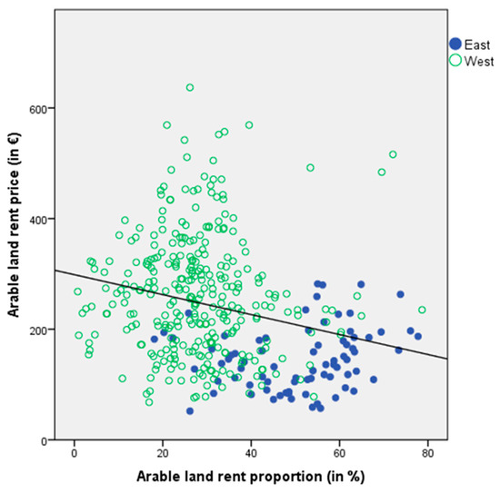 For the purpose of this analysis, the smallest but nation-wide uniformly assessed spatial unit for Germany is the statistical unit NUTS-3 (county level). The “Nomenclature des Unités territoriales statistiques—NUTS” represents statistical regions within the EU and facilitates the supranational statistical comparison of such regions. NUTS-3 regions represent the statistically (based on the population) smallest regions. In Germany, NUTS-3 regions represent counties and corporate cities and number 402 in total [39,40]. To ensure a nation-wide uniform analysis of data based on the Agricultural Census from 2010, data were requested from the Statistical Agency of Germany. Statistical data from all federal states of Germany were requested with a response rate of 15 out of 16 (federal state statistical offices). After a data preparation and cleansing process, 389 out of 402 NUTS-3 regions were used for further analysis. In addition to four corporate city regions, the data for six NUTS-3 regions from one federal state were not available. For the purpose of our analysis, data on arable land rent proportion at the NUTS-3-level could not be derived directly from the acquisition, but data on rent prices could be derived directly for NUTS-3 regions.