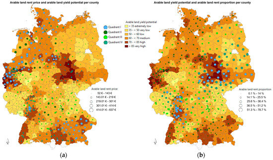 We have divided the XY diagrams of all three combinations of arable land rent price, rent proportion and yield potential into four quadrants in order to more easily discuss possible explanations to the empirical findings (Table 3) and connect them to the spatial visualization of all three variables at the end of the discussion (Figure 5).