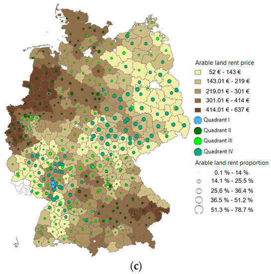 Table 3C visualizes the relationship between arable land rent proportion and rent price. Quadrants II and IV represent theoretically expected relationships: a low rent proportion of arable lands is linked to high rent prices (II), and a high rent proportion of arable lands is linked to low rent prices (IV). Quadrants I and III are contrary to the theory: a low rent proportion coincides with low rent price (III), and high rent proportion coincides with high rent prices (I). Our empirical analysis revealed a very weak to no correlation. Although the almost empty quadrant I supports the theoretical assumptions, a high number of cases in Quadrant III deviate from the theory about the relationship between arable land rent proportion and rent price. The three cases in Quadrant I represent very specific urban-type counties with low levels of arable land. Possible explanations for the high number of cases in Quadrant III are a low demand for or supply of leased arable land [27]. Additionally, the abovementioned explanations of rent price fixation or internalized costs of soil protection or other issues in lease contracts might determine the correlation between low rent proportion and rent price. Another reason might be the isolated location of arable lands in counties with large areas of forests or mountainous regions that decrease the value of arable land for potential leaseholders, thereby enhancing farm operation by landowners. From the perspective of tenancy agreements, central research gaps concur with the abovementioned research needs, i.e., to clarify the details in the fixation of soil protection measures in lease contracts and its influence on rent price formation [50]. This is of crucial relevance for agricultural systems with high arable land rent proportions, such as those in Germany.