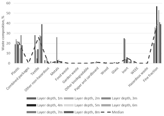 The morphological composition of landfills was investigated experimentally by the method of drilling (Alytus) or excavation (Torma). Investigations were made according to the Standard Test Method for Determination of the Composition of Unprocessed Municipal Solid Waste (D 5231-92). In Alytus, three drillings were conducted with a 15-cm drill in specified parts of the first section (which has been operating from year 2007 onwards—later we will talk specifically about the first section) and waste samples were drawn every meter between 1 and 10 m in depth [33]. In total, 285 kg was excavated. The waste was sorted into four size fractions (>80 mm, 80–40 mm, 40–20 mm, and <20 mm). The waste was classified into paper and cardboard, glass, textiles, soft plastics, hard plastics, medical and other non-combustible, electronics, and fine fraction. The results of the investigation are presented in Figure 2 (WEEE—Waste Electrical and Electronic Equipment).
