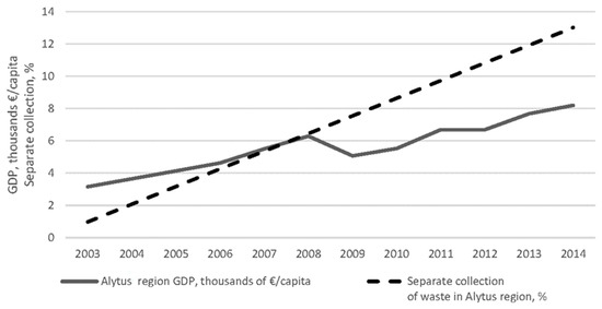 Changes in GDP (Gross domestic product) and separate collection rates of waste in the Alytus region, both of which were used in calculations, are presented in (Figure 3) [37,38].